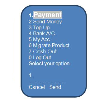 ডাচ্-বাংলা ব্যাংক এর মোবাইল ব্যাংকিং সংক্রান্ত USSD মেনুতে যাওয়ার জন্য প্রথমে মোবাইল থেকে *322# ডায়াল করুন। তারপর নিম্মোক্ত মেনু হতে Payment করার জন্য 1 টাইপ করে SEND দিন।